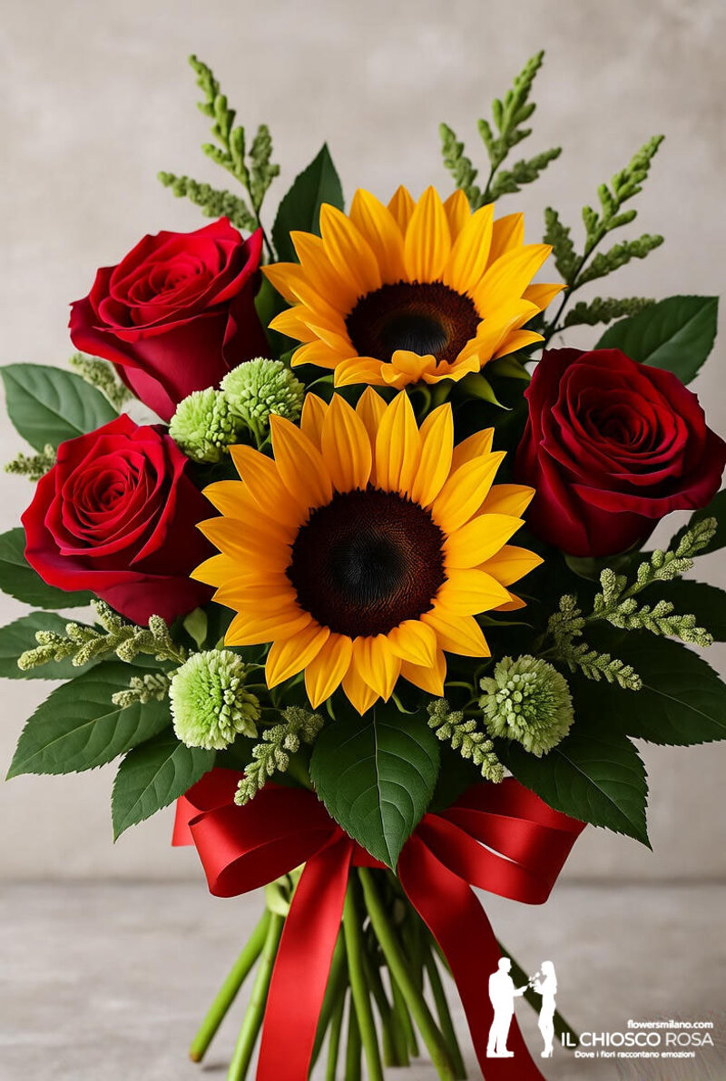 Girasoli e Rose Rosse: l'incontro perfetto tra il calore del sole e il fuoco dell'amore.